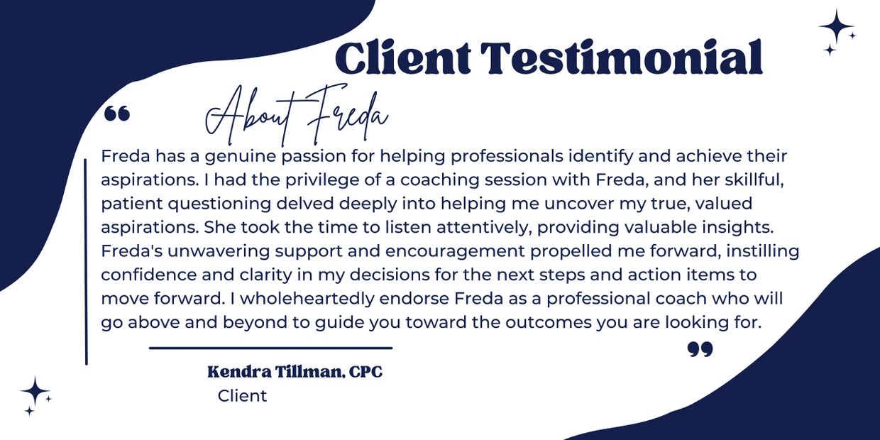 Freda holds dual coaching certifications from the International Coaching Federation and the Institute for Professional Excellence in Coaching. She offers personalized 1:1 coaching for career professionals and managers facing stagnation, using a holistic approach to dismantle success inhibitors like assumptions and false beliefs. Freda helps clients trace and overcome these thoughts to move forward. Her strategic coaching includes identifying desired career paths and ideal work environments. For job seekers, she has a proprietary method to align clients' goals with those of potential employers.