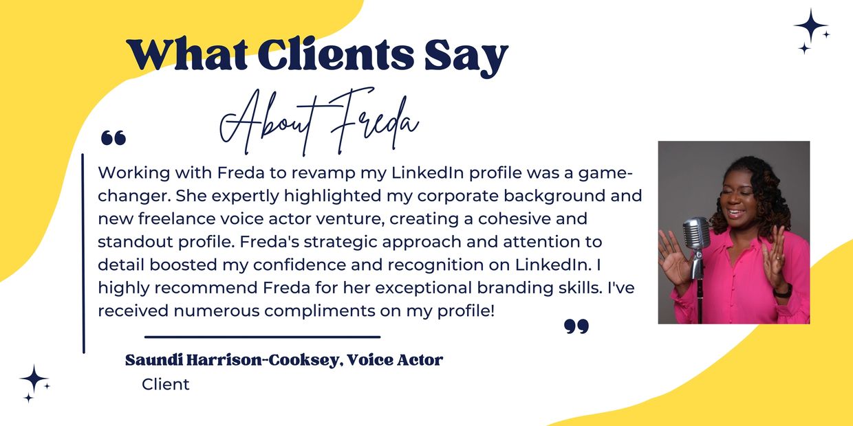 When Freda revises or creates your LinkedIn profile, it will include a new title/headline, a revised About Section, and key accomplishments for each position. Your revised profile will also include key words related to positions of interest to increase your rank in search. Here's a LinkedIn profile Freda created. Freda has been recognized as a LinkedIn Top Voice under three designations, Career Path Planning, Career Development Coaching, Career Coaching.